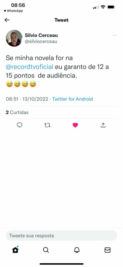 Nesta quinta-feira (13), o romancista e roteirista Silvio Cerceau publicou em seu perfil do Twitter que se a sua novela for transmitida na RecordTV, ele garante de 12 a 15 pontos de audiência.