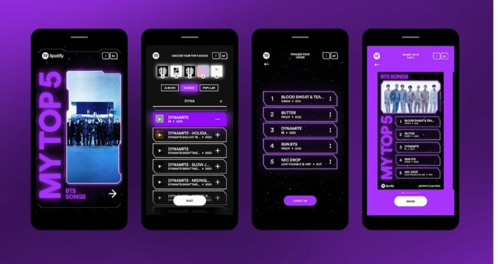 My Top 5: BTS Songs marca a nova etapa da experiência interativa do Spotify após o grande sucesso com outros ícones, como The Weeknd, Kendrick Lamar e ROSALÍA, que receberam interação gigante dos seus fãs mundialmente.