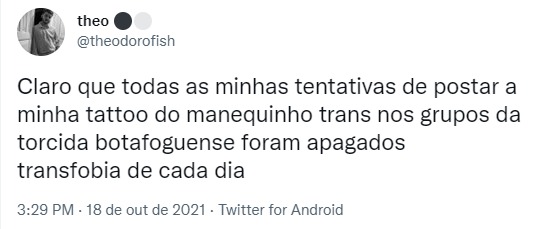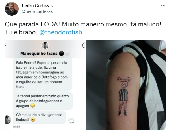 Nesta segunda-feira, 18, um torcedor trans do Botafogo, Theodoro Fish, afirmou ter sido silenciado por outros torcedores após tatuar a versão trans de Manequinho, o mascote do time. Nas redes sociais, o jovem recebeu apoio de Pedro Certezas, comentarista esportivo e botafoguense.
