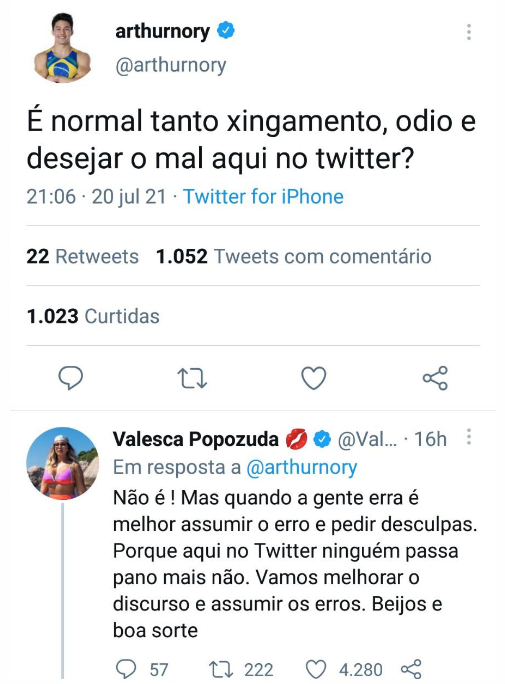 Na manhã desta quarta-feira (21) nome do ginasta Arthur Nory voltou a ser assunto no Twitter. Tudo começou com desabafo. Na rede social, ele escreveu: “É normal tanto xingamento, ódio e desejar o mal aqui no twitter?”. A cantora Valesca Popuzuda, respondeu em sequência: “Quando a gente erra, é melhor assumir”.
