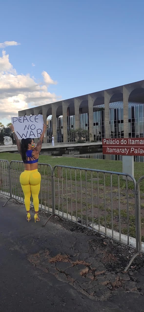 Famosa por ter o maior bumbum do Brasil, Vanessa Ataídes protestou contra a invasão da Ucrânia em frente à embaixada russa, em Brasília. Com um cartaz com os dizeres “Peace no war” (Paz não guerra) e vestida de azul e amarelo, cores que representam a bandeira ucraniana, a modelo quis mostrar seu descontentamento com a postura da Rússia.