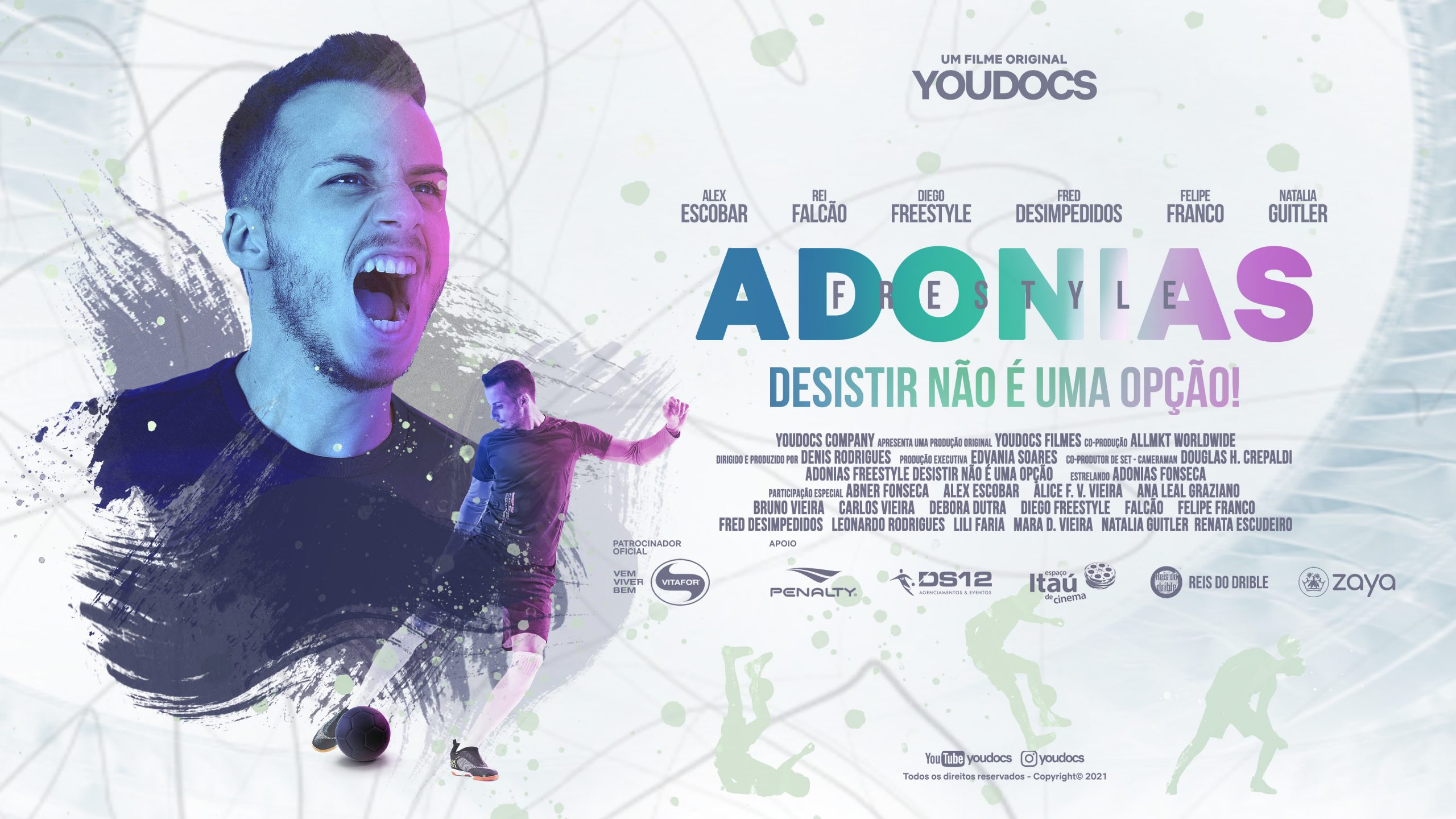 Considerado um dos principais nomes da modalidade no Brasil, Adonias já foi campeão nacional e destaque internacional. O filme documental narra o início de toda a história até o momento atual de conquistas, com comentários e participações especiais do ex-jogador de futsal Falcão, eleito o melhor de todos os tempos pela FIFA, o apresentador do Desimpedidos, Fred, a jogadora de Futevôlei e Teqball, Natalia Guitler, o empresário, fisiculturista e vereador em São Paulo, Felipe Franco, o apresentador do Globo Esporte, jornalista e comentarista esportivo, Alex Escobar e, ainda, o pioneiro na modalidade de Futebol Freestyle no Brasil, Diego Freestyle.