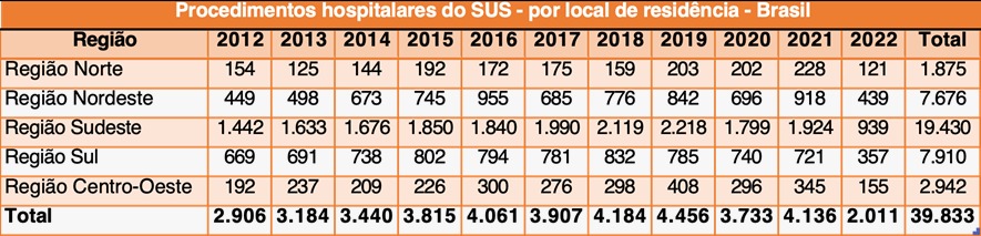 A maior parte dos procedimentos realizados no país se concentram na região Sudeste, com 49% (19.430) dos registros relacionados às internações para tratamento de aneurismas da aorta. Já o Norte foi a região que menos contabilizou casos da doença, com 1.875 internações. Na tabela abaixo, há outros detalhes da quantidade dos procedimentos hospitalares, realizados de janeiro de 2012 a maio de 2022, em cada região brasileira.