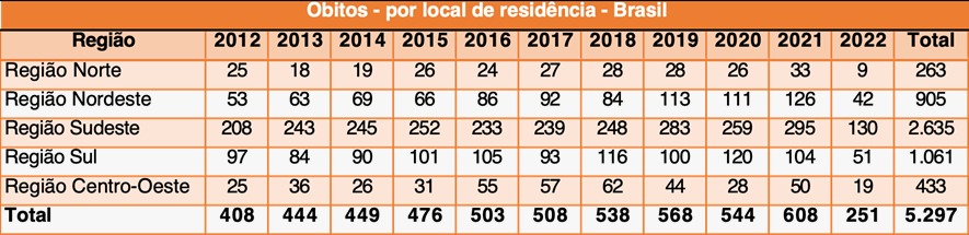 Já os dados relacionados aos óbitos em decorrência do problema vascular apontam que 5.291 pessoas perderam a vida de janeiro de 2012 a maio de 2022. Assim como no ranking das internações, o Sudeste brasileiro lidera com 50% dos registros, ou seja, a região concentra 2.635 mortes pela doença, como mostra a tabela abaixo.