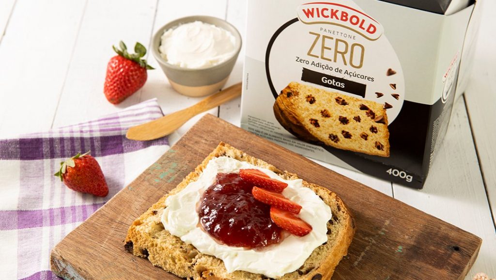 Nas redes sociais, a marca indicou uma combinação: Panettone Wickbold Zero Açúcar Gotas de Chocolate com cream cheese e geleia de morango