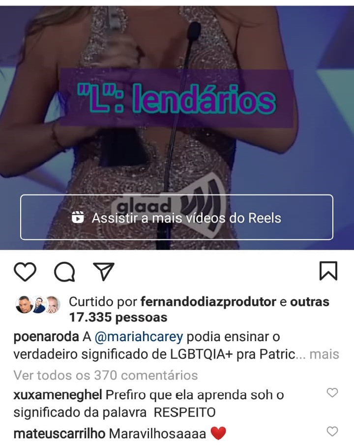 Em outra publicação em que aparece um meme em que a cantora Mariah Carey ensina sobre a sigla LGBTQIA+, a apresentadora comentou: “Prefiro que ela aprenda soh o significado da palavra RESPEITO”, fazendo referência a Patricia Abavanel.