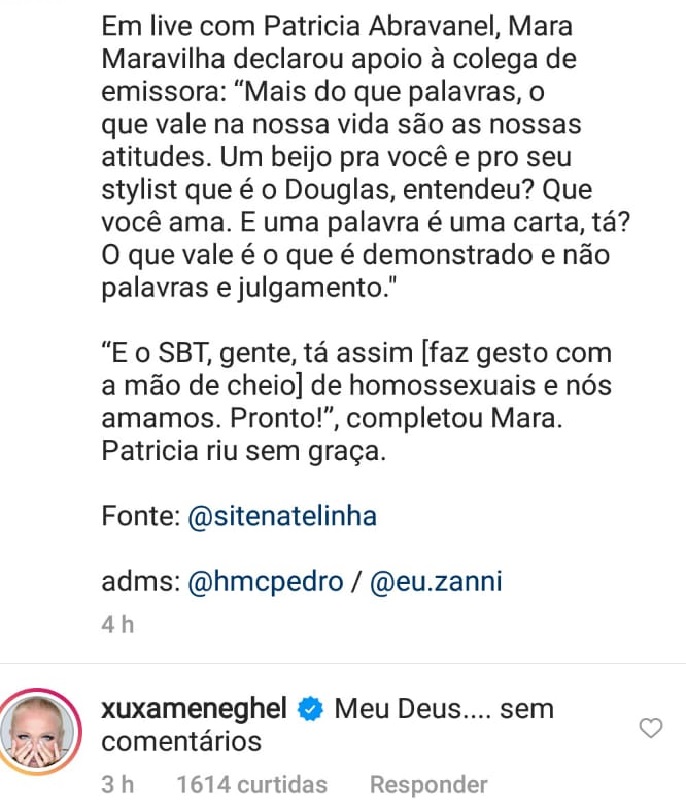 “Mais do que palavras, o que vale na nossa vida são as nossas atitudes. Um beijo pra você e pro seu stylist que é o Douglas, entendeu? Que você ama, E uma palavra é uma carta, tá? O vale é o que é demonstrado e não palavras e julgamentos. (…) E o SBT, tá assim (gesto de cheio) de homossexuais e nós amamos. Pronto!”, falou Mara. Nos comentários, Xuxa escreveu: “Meu Deus… sem comentários”.
