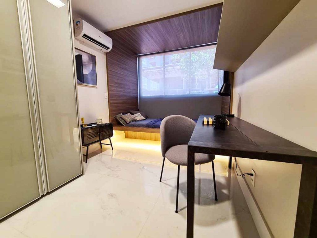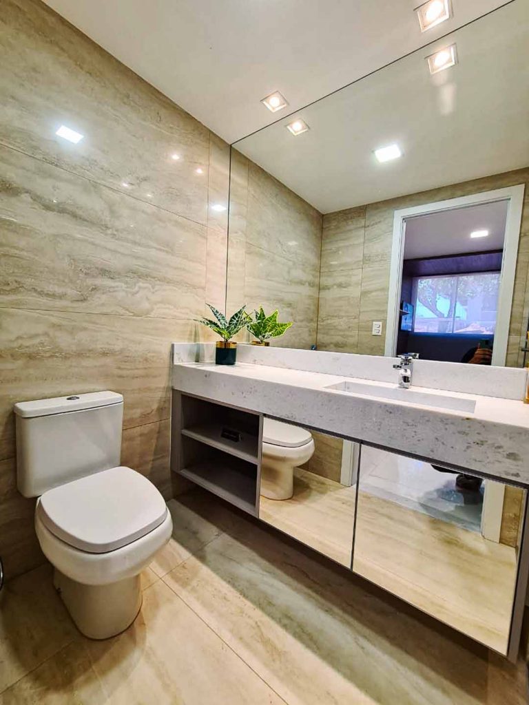 Nessa opção de planta ela optou por fazer o armário. Sandra também usou vidros reflexivos que ajudam dar amplitude ao ambiente dando um toque todo especial.