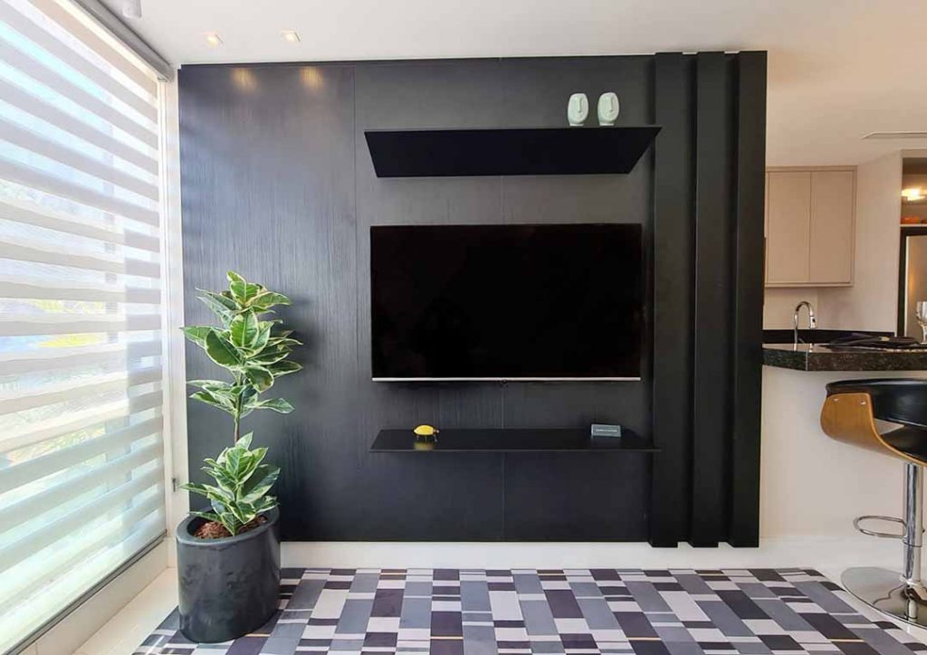 Logo que você entra na sala se depara com um lindo painel todo projetado nos mínimos detalhes de traços e ângulos pela arquiteta Sandra.
