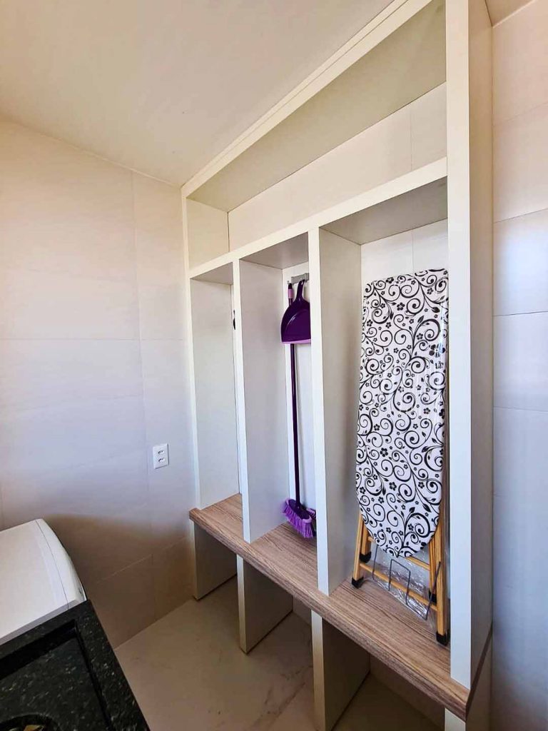 Tem o nicho certo para guardar o balde, a tábua de passar roupa, as vassouras, o cabideiro. Perfeito!!