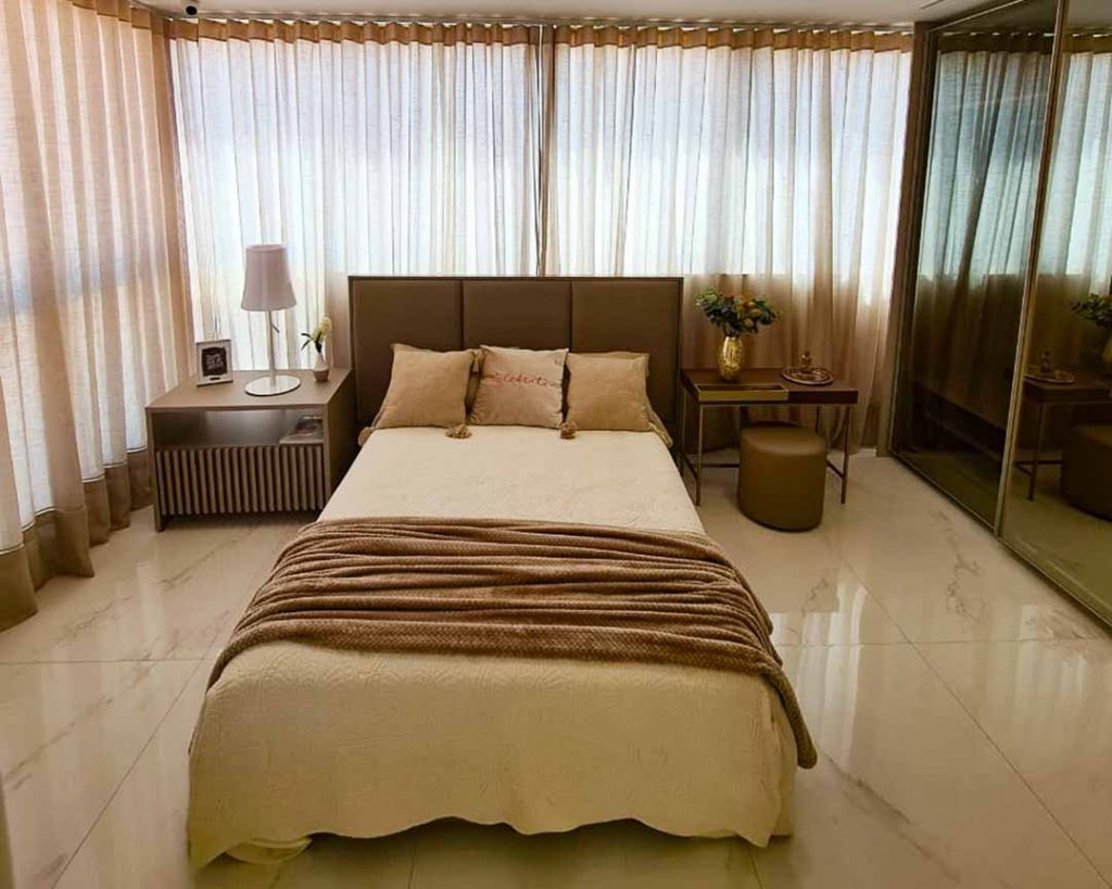 Outra dica interessante, foi deixar um pequeno espaçamento do encosto da cama com a janela suficiente para acomodar a cortina que também vai do teto ao chão.
