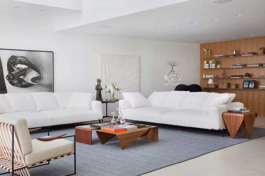 Para salas em tons neutros, fica muito interessante dar mais vida ao ambiente com um tapete que tenha cores mais vivas. Ou, se a sua intenção for só a sensação de aconchego opte pelas cores neutras sem estampas.