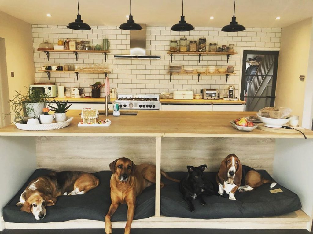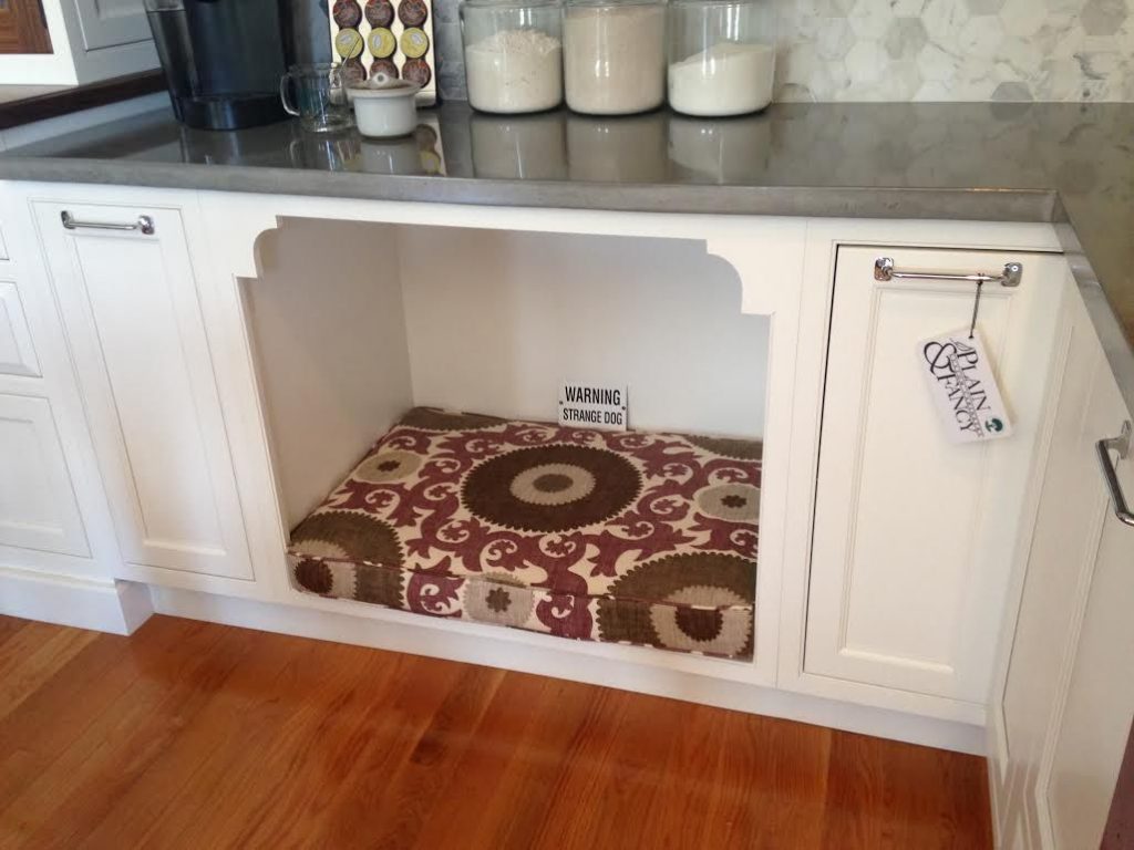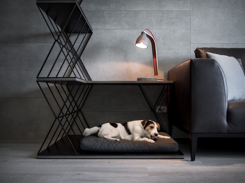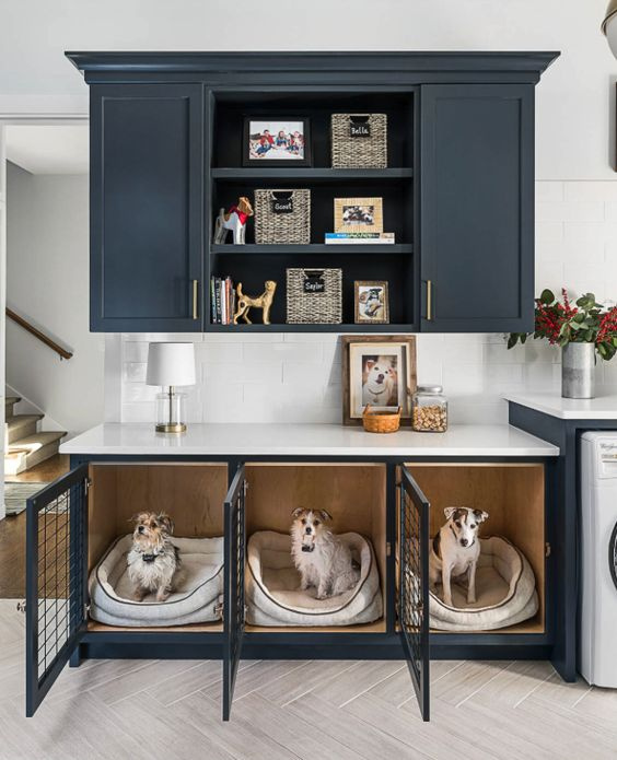 Você também pode investir em móveis sob medidas já planejando os nichos para seu pet. Uma caminha de baixo da bancada, lugar para a água e comida, um armário para organizar os objetos e brinquedinhos deles.