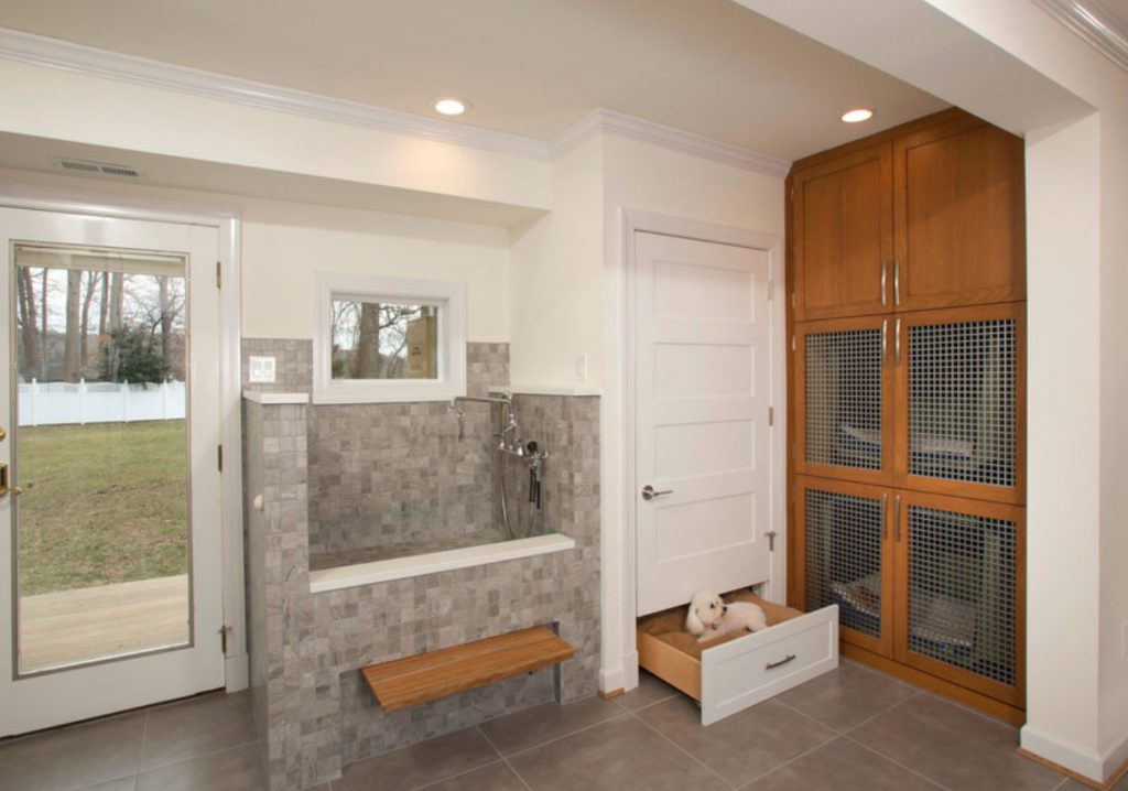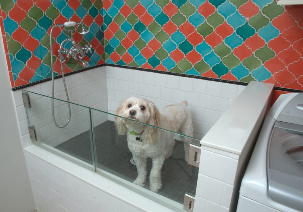 Quem quiser, pode investir também, em móveis personalizados. Está super na moda a instalação de dogs-showers. Um lugarzinho que você pode montar com um chuveirinho para dar banho no seu pet. Você pode instalar na sua área de serviço, quintal, garagem ou canil.