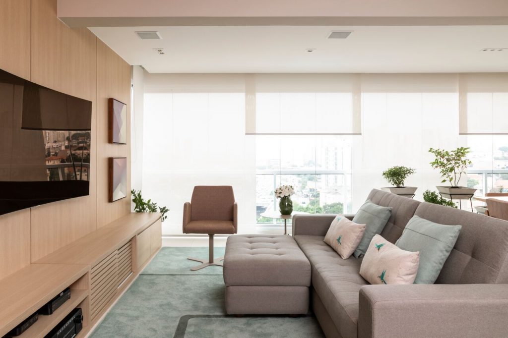 Nos ambientes integrados procure posicionar a TV de forma que ela esteja voltada para todos os ambientes na medida do possível. Por exemplo, uma parede que te permita ver da varanda, da sala de jantar… fica ótimo para assistir um jogo ou colocar shows na hora de receber os amigos.