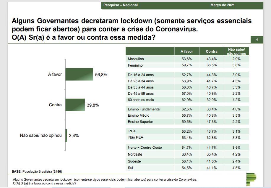 No recorte da pesquisa, observa-se que as mulheres (59,7%) são mais a favor do lockdown que os homens (53,6%). As restrições também são mais apoiadas pelos mais velhos. O índice sobe gradativamente nas cinco faixas etárias de 16 a acima de 60 anos, detalhados pela pesquisa. O leitor pode encontrar os detalhes no nosso portal.