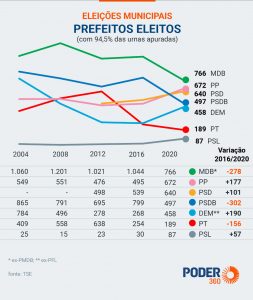 De acordo com o gráfico do Poder 360, o PT tinha 409 prefeituras em 2004, passou para 558 em 2008, 638 em 2012, e nos anos seguintes começou a definhar.