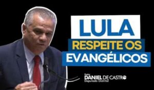 O pastor Daniel de Castro, do PP, não apareceu de amarelo, mas ficou ao lado de um aviso dirigido ao presidente da República: “Lula, respeite os evangélicos”.