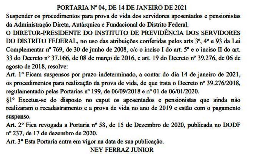 Publicação – Na manhã desta sexta-feira, o Diário Oficial do DF (DODF) trouxe em suas páginas a publicação oficializando o “cancelamento da prova de vida”.