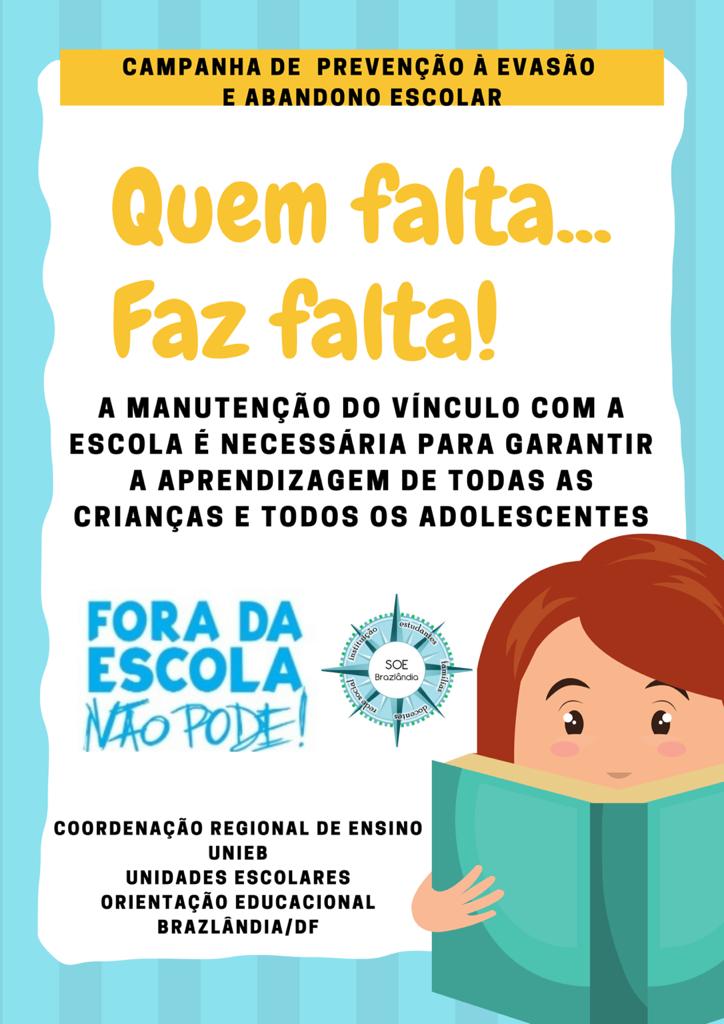 “Quem falta faz falta” é uma campanha de comunicação idealizada pelo Serviço de Orientação Educacional de Brazlândia, com o apoio da Coordenação Regional de Ensino, com o objetivo de mobilizar e engajar a comunidade escolar na garantia do direito à educação das crianças e dos adolescentes, com ênfase na prevenção da evasão e abandono escolares durante os meses de dezembro/2020 e janeiro/2021.