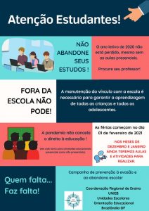 Durante os dias 10 e 11 de dezembro será realizada uma grande ação de mobilização da comunidade urbana e rural de Brazlândia, com uma caminhada e distribuição de panfletos informativos pela cidade, no intuito de disseminar informações pertinentes ao encerramento do ano letivo de 2020.