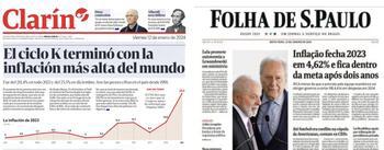 Já a manchete da ‘Folha de S.Paulo’ de hoje destaca que a inflação do Brasil fechou em 4,62%, ficando dentro da meta depois de dois anos.