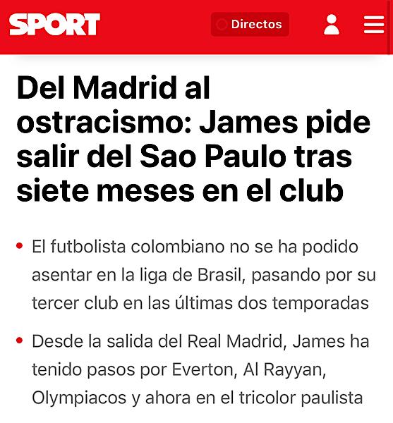 Enquanto isso, o jornal espanhol ‘Sport’ deu destaque à demissão de James Rodrigues com essa manchete: “Do Real Madrid ao ostracismo. James pede para sair do São Paulo, após sete meses no clube”