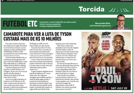 O portal mostra detalhes de um notável pacote de ingressos VIP para a luta entre Mike Tyson e Jake Paul, estipulado em 2 milhões de dólares (mais de R$ 10,3 milhões).