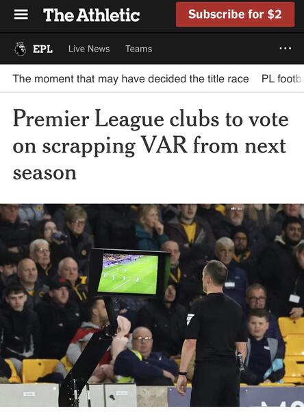 Uma extensa reportagem do The Athletic, o segmento de esportes do The New York Times, aponta que os clubes da Premier League devem realizar uma votação em sua Assembleia Geral anual, no próximo mês, sobre uma proposta para abolir o sistema de Árbitro Assistente de Vídeo (VAR), a partir do início da próxima temporada.