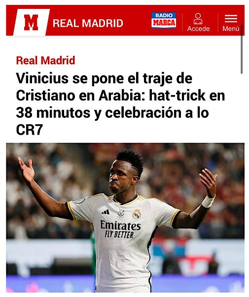 Esta é a análise do jornal ÁS, da Espanha, sobre o desempenho de Vinícius Jr., na goleada do Real Madrid sobre o Barcelona, por 4 x 1, neste domingo (14), quando marcou três gols. Nem Cristiano Ronaldo conseguiu isso contra o Barça com a camisa 7 do Real.