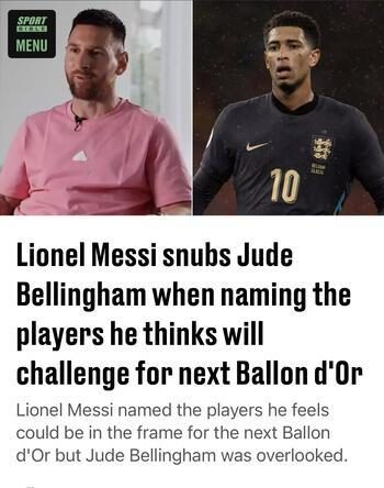 O site SPORTbible pareceu incomodado com o fato de Messi não ter incluído o inglês Bellingham entre os candidatos do futuro. Por isso, o título da matéria é: “Lionel Messi despreza Jude Bellingham ao nomear os jogadores que ele acha que irão disputar a próxima Bola de Ouro”.
