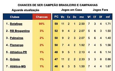 Enquanto isso, de acordo com os matemáticos do site Infobola, o Botafogo está com 90% de chances de ser campeão nesta temporada, enquanto Bragantino (3%), Palmeiras (2%) e Flamengo (2%)reduziram suas possibilidades.