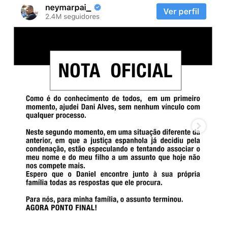 Neymar da Silva Santos, pai de Neymar, resolveu se pronunciar, após o assunto ganhar as páginas de todo o noticiário esportivo, e, em Nota divulgada à imprensa, disse que, desta vez, não vai colaborar com Daniel Alves.