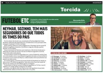 Em números gerais, os 20 times da primeira divisão do Brasileirão (ver relação abaixo), somam 216 milhões de seguidores. Todos eles, juntos, ficam bem abaixo de Neymar, que, sozinho, tem 220 milhões apenas no Instagram.