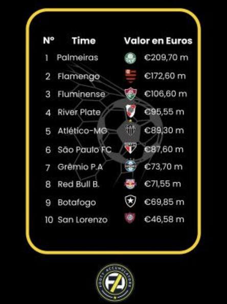 O Footy Accumulators, site especializado em bônus de inscrição e premiações de apostas esportivas, fez uma análise da avaliação de mercado dos principais clubes da Copa Libertadores bem como a avaliação global das principais competições de clubes do mundo.