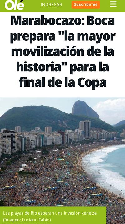 Diz uma reportagem do jornal argentino “Olé”, assinada por Ramiro Scandolo, sob o título: “Marabocazo, Boca prepara a maior mobilização da história para a final da Copa Libertadores”.