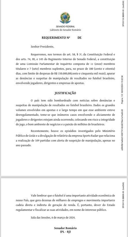 No requerimento assinado por Romário, o ex-jogador tetracampeão do mundo justifica: