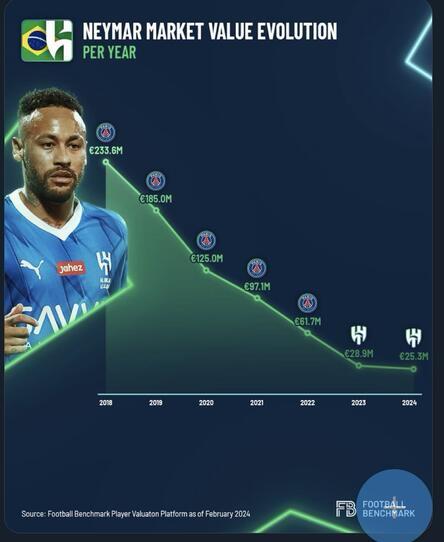 Neymar atualmente ainda figura no top-10 dos jogadores mais valiosos do Sauditão. Entretanto, segundo dados do site Football Benchmark, o seu valor de mercado caiu mais de € 200 milhões em cinco anos (aproximadamente R$ 1 bilhão), como você pode ver nesse gráfico abaixo.