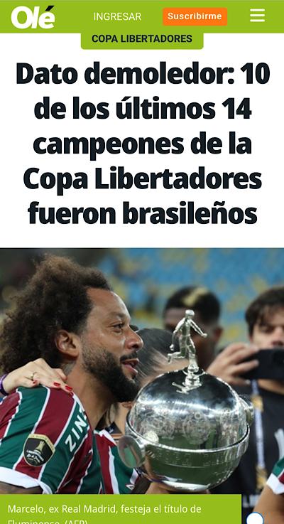 Esta semana, o jornal Olé da Argentina publicou longa reportagem, onde retrata a supremacia brasileira nos torneios da Conmebol, especialmente a Libertadores.