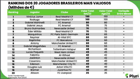 Um levantamento da Pluri Consultoria destaca os rankings dos 50 atletas mais valiosos do mundo e dos 20 jogadores brasileiros mais bem posicionados nessa lista.