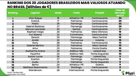 Na primeira posição, Vitor Roque permanece como o jogador brasileiro mais valioso atuando no Brasil, com um valor. Em seguida, o palmeirense Endrick, com apenas 17 anos, avaliado em €25 milhões.