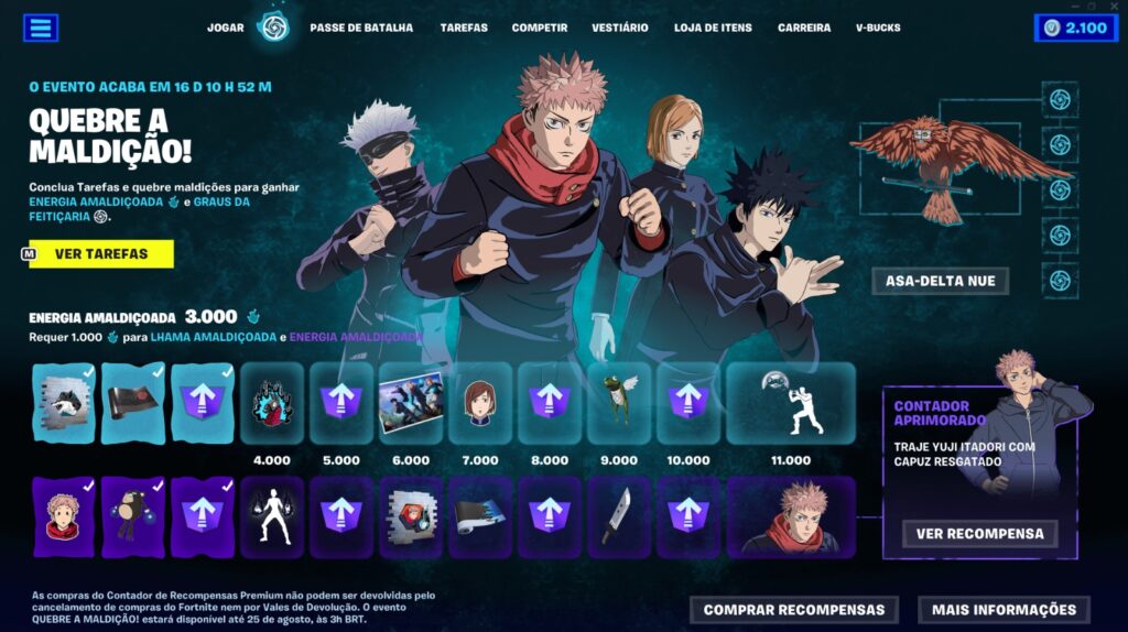 Quanto à skin do Yuji Itadori, é possível ganhá-la realizando as tarefas do evento através do Contador de Recompensas Premium. Mas se você não quer gastar dinheiro e ainda assim ter algumas recompensas, destrua as Lhamas amaldiçoadas para aprender técnicas amaldiçoadas e use o que aprender para concluir as Tarefas Quebre a Maldição, para ganhar itens e subir de nível.