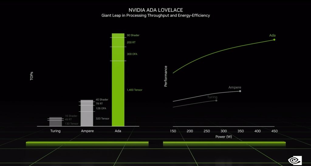 As novas placas têm a nova arquitetura TSMC 4nm Ada Lovelace da Nvidia, RTX de terceira geração, Tensor Cores 4ª geração e codificador AV1, que fazem as anteriores comerem poeira na capacidade. Com 76 bilhões de transistores, memória Micron G6X e a nova tecnologia DLSS 3, elevam os gráficos à 100fps em 4k. Tá bom pra você?!