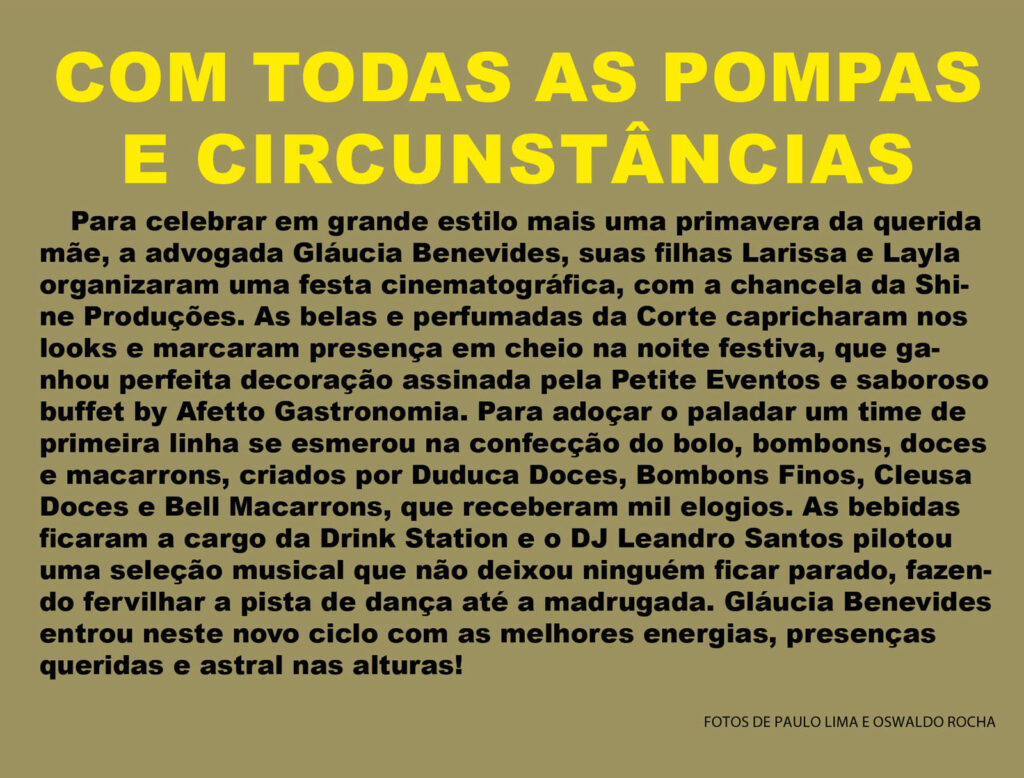 Gláucia Benevides, com as filhas Layla e LarissaIsaura Lara Resende, Sandra Costa e Cláudia TolentinoCleucy Oliveira e Suely NakaoAndréa Ghisi e Vera Carla SilveiraEmbaixatriz Vânia Vilalva e Janete CollaresCláudia Meireles, Márcia Zardo e Sônia AbrantesRosália Peixoto e Tamara BontempoGláucia e Solange FerrerVanessa Lemos, Gláucia Benevides e Roseane JordãoIsabela Lira e Gislene BorgesSônia Lim e Ana Paula Gontijo