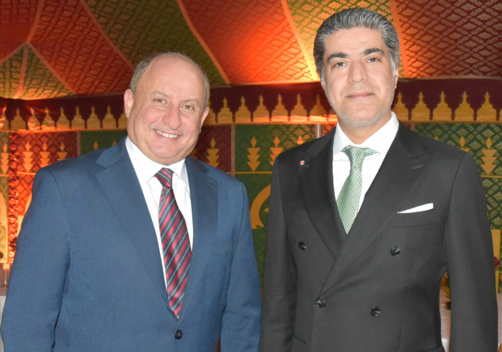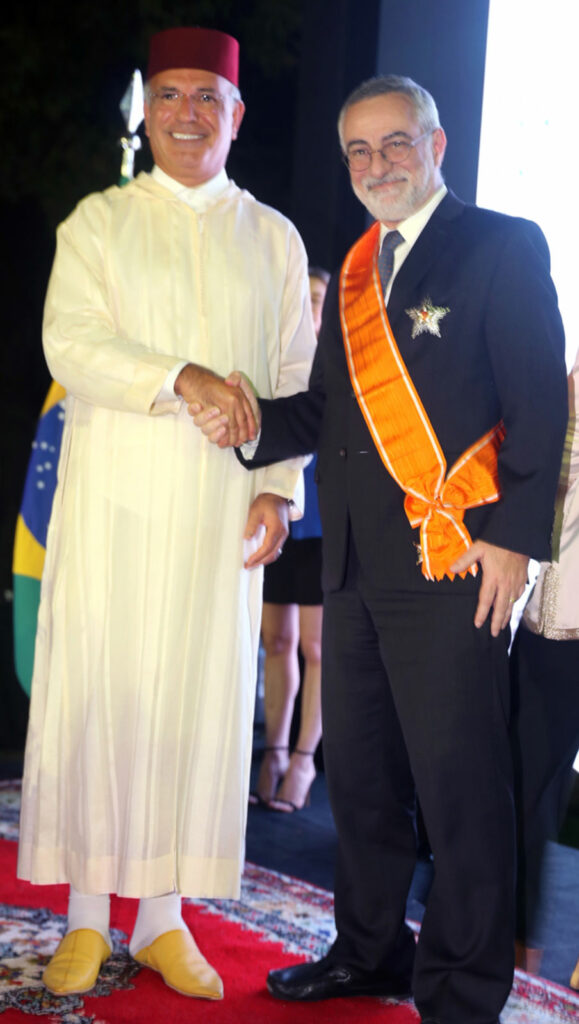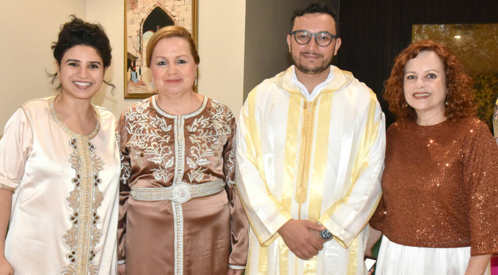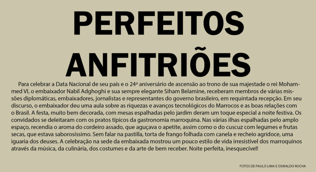 A embaixatriz Siham e o embaixador Nabil Adghoghi, com o ministro aposentado Marco Aurélio de MelloO encarregado de Negócios Firas Hassan Al-Hammadany e embaixador de Omã Talal Al-RahbO embaixador Nabil Adghoghi e o empresário Ardisson AkelO anfitrião prestou homenagem ao diplomata Júlio BitelliClarice e Luiz Afonso Costa de Medeiros, e Ana Carolina Costa e SilvaFlávio Marcílio e Janete VazOdilon e Sandra Costa, Eduardo Araújo Jorge e CarlaHiba Faouzi, Dina Melehi, Faiçal Seman e Queila ElerJelena BlazevicO jornalista Alexandre Garcia e Magda PereiraRaquel e Jackson Almir Corbari