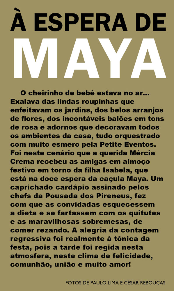 A alegria de Mércia, com as filhas, Tatiana Fragoso e Isabela Crema, muito feliz no aguardo de MayaCleucy Estevão e Wilma PereiraJacqueline Magalhães e Janete VazIara Castro, Rita Márcia Machado e Adriana ColelaValdete Drumond, Vera Coimbra e Rita LinsSilvana Monte Rosa, Soraia Faraj Vieira e Márcia ZardoDenise Barbosa, Gláucia Benevides e Margarida Kalil