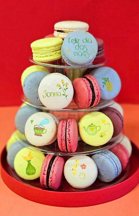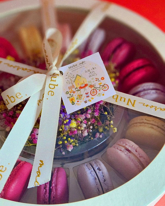 Famoso por seus macarons diversos e saborosos, o Nube Café preparou um cardápio especial para o Dia das Mães, oferecendo cestas para todos os gostos. Dentre as opções disponíveis, destaca-se a Torre na Caixa, que acompanha 40 macarons com a possibilidade de escolher entre 21 sabores, sendo 8 unidades decoradas de forma personalizada.