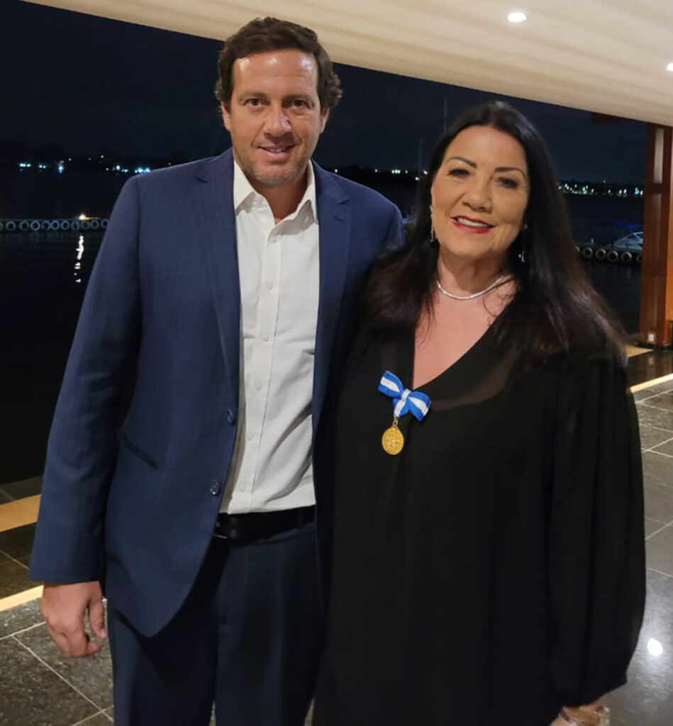 Em cerimônia no Clube Naval a querida pioneira Adriana Colela, ao lado do filho, o advogado Bruno Maciel, exibe a Medalha do Amigo da Marinha, que merecidamente lhe foi conferida pelo Comandante do 7º Distrito Naval, vice-almirante Gilberto Santos Kerr.
