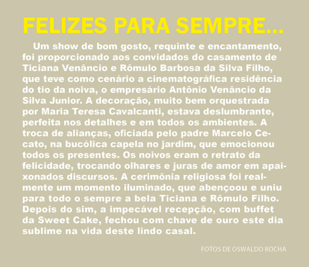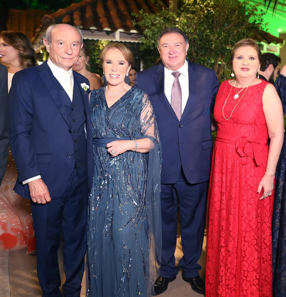 A felicidade dos noivos, Ticiana e Romulo FilhoOs pais dos noivos, Rômulo Barbosa da Silva, Vera Lúcia Pimenta, Carlos Flávio Marcílio e Priscila Venâncio da SilvaMaria Pia Marcondes Ferraz e as filhas, Sylvia e AllegraCarlos Flávio Marcílio e Janete Vaz, deputado Átila Lins e Rita Antônio Venâncio e Fernanda AdrianoA elegância das irmãs, Auristela Constantino e Cristiane Foresti