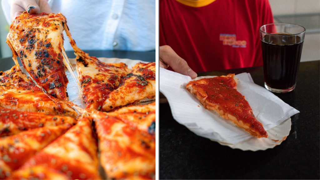 Aos puristas de plantão, peço que segurem a língua, pois pouquíssimos locais na cidade são tão marcantes e capazes de levar o brasiliense a comer em pé ou sentado no meio fio. A fatia “simples ou dupla”, que muitos debatem se é, de fato, uma pizza, ou um pão, pode irritar uns e outros, mas quem ama, ama de verdade. A unidade da 107 Sul é a minha preferida por vários motivos: fica na rua da Igrejinha, me deixa saudosa do querido Hely, da família proprietária, e ainda é a única que ainda carrega aquele pequeno e charmoso caos de produtos vendidos, entre chocolates hidrogenados, cigarros de palha, balinhas e isqueiros. Apesar dos questionamentos quanto à qualidade, a massa é realmente uma receita da família, e não há qualquer produto parecido na cidade. Eu genuinamente adoro a pizza da Dom Bosco, não só pela nostalgia, mas justamente pela fartura de queijo, molho e a base da massa que parece saída da chapa, com manteiga.